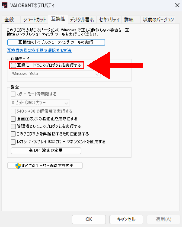 互換モードでこのプログラムを実行するをクリックしましょう。
