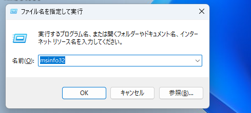 Windowsボタン+Rを同時押しします。ファイル名に【msinfo32】と入力しOKを押しましょう。