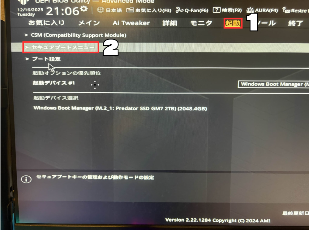 画面右上にある【起動】を選択し、セキュアブートメニューをクリックしましょう。