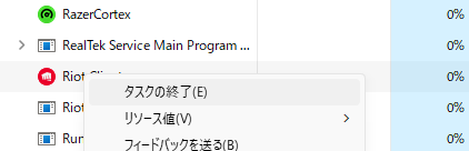 【ステップ2】Riot Games・VALORANTを右クリック→タスクの終了