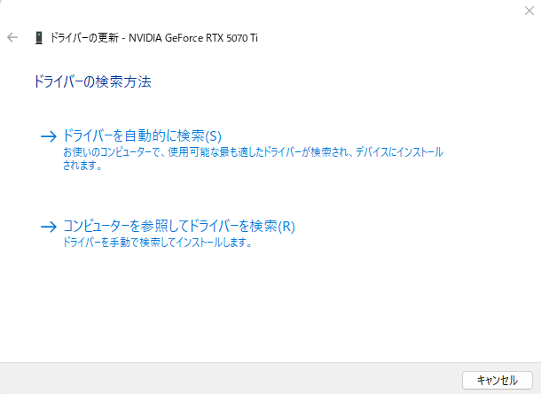 ドライバーを自動的に検索を選択し、画面に沿って更新を続けましょう。